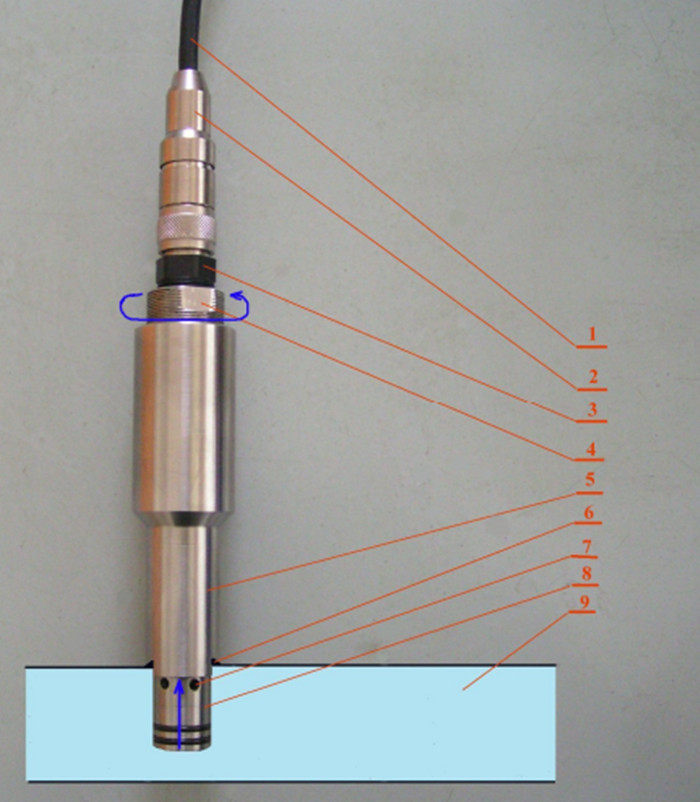 操作过程中,氧气传感器的拧紧操作如下:断开连接器(位置 2),旋转接头内部(位置 4),使其朝向蓝色指示器。测量室(位置 8)插入接头内部,并借助两个 o 形圈密封接头内部(见图 1),因此无需停机。拧紧接头内部后,无需停机即可更换氧气传感器;同样,消毒过程中,光学传感器无需接触消毒介质即可进行(见图 2)。